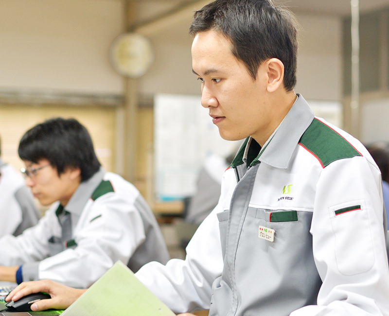 ベトナム出身の私は、大学進学のために長岡に来ました。4年の留学期間の中で、この土地の景色やお米、花火が好きになり、長岡の企業に就職することを決心しました。国際交流もしたい私にとって、グローバル企業である日本精機は理想的な就職先でした。現在は生産技術部で工程設計を担当しています。最も効率良く生産ラインを組み立てるために順序や作業人数、作業時間などを考える仕事です。製品をより高品質・低コスト・短時間で生産することをめざします。私は海外工場の2輪と4輪の機種を担当。現地の技術スタッフとメールやテレビ会議で打ち合わせをしています。工程設計を学び始めたばかりなので、先輩のアドバイスをもらいながら、日々勉強しています。